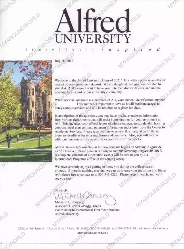 录取的学生们收到的录取通知书是由Alfred University (阿尔弗莱德大学)颁发的正式大学本科录取通知书,不是预科。
