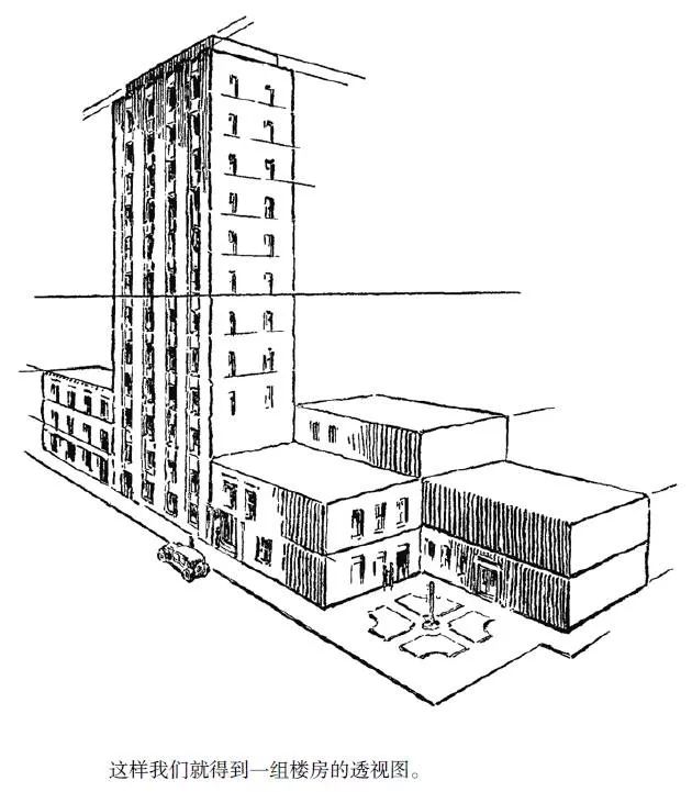 你站在高层办公室的窗前对着窗外的楼群做速写时,就可以把那些大楼想象成一层一层堆起来的砖块,就像我们前几页做的那样。